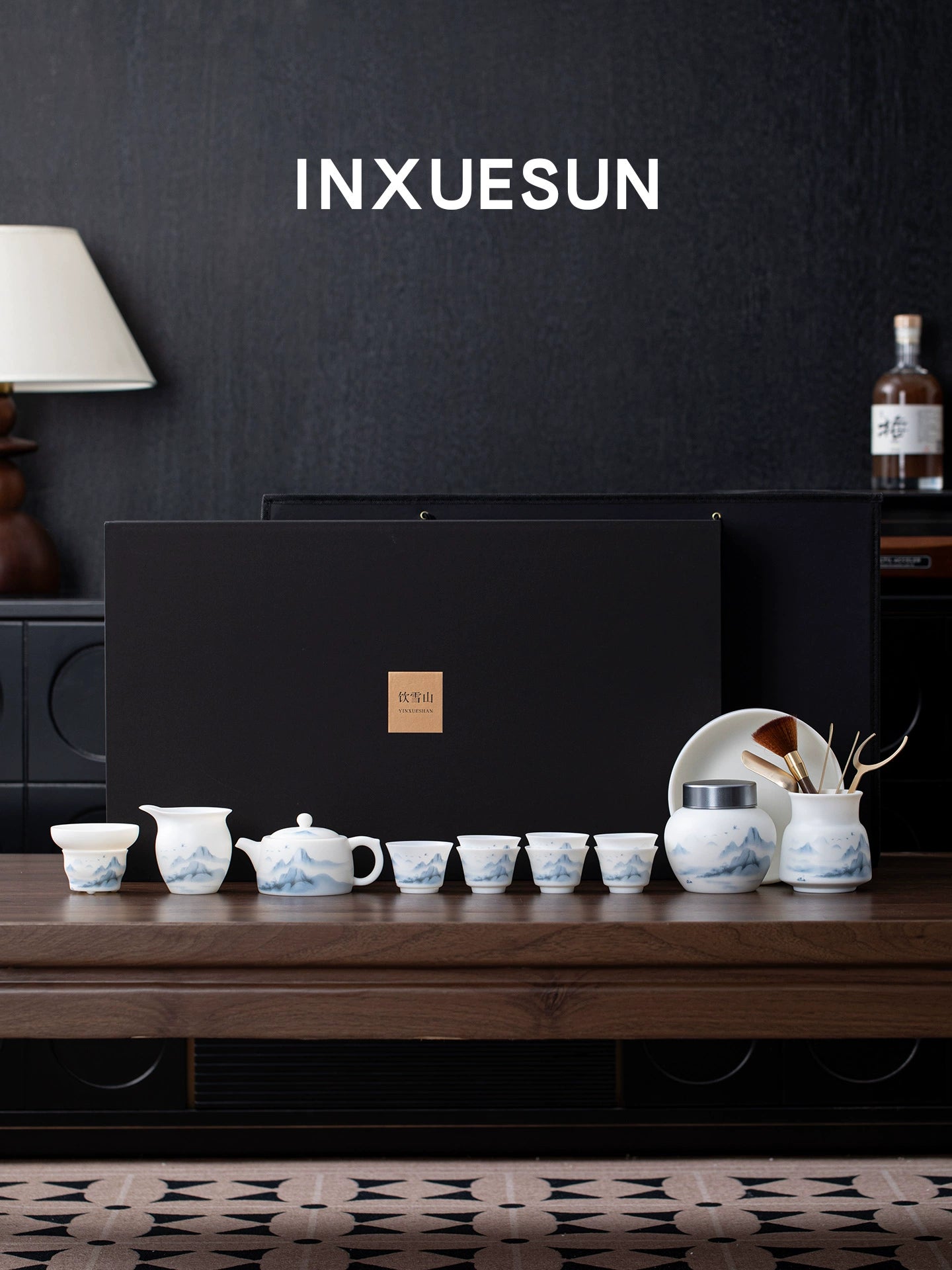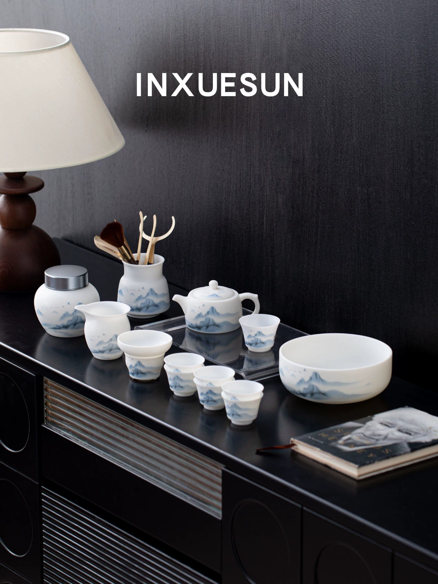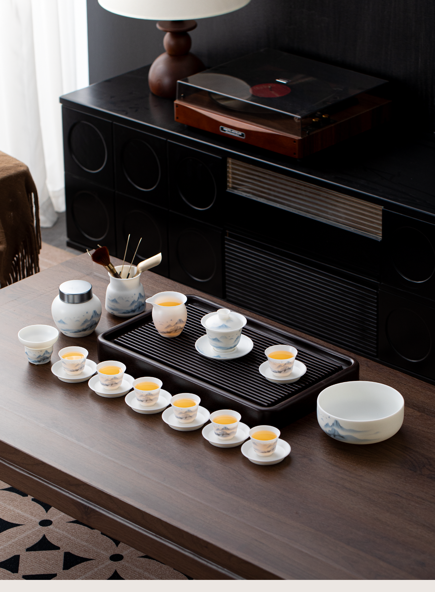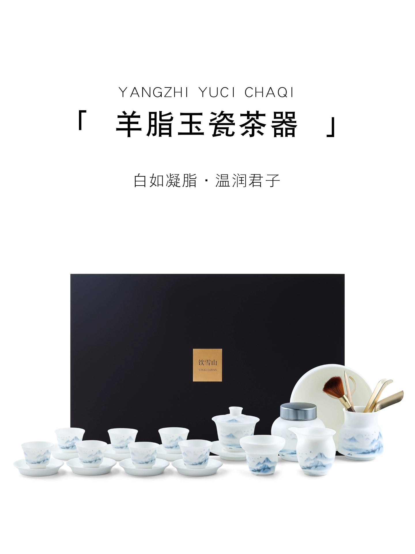 Vegetarian-fired suet jade porcelain kung fu tea set, home high-end office tea, housewarming gifts for elders and leaders