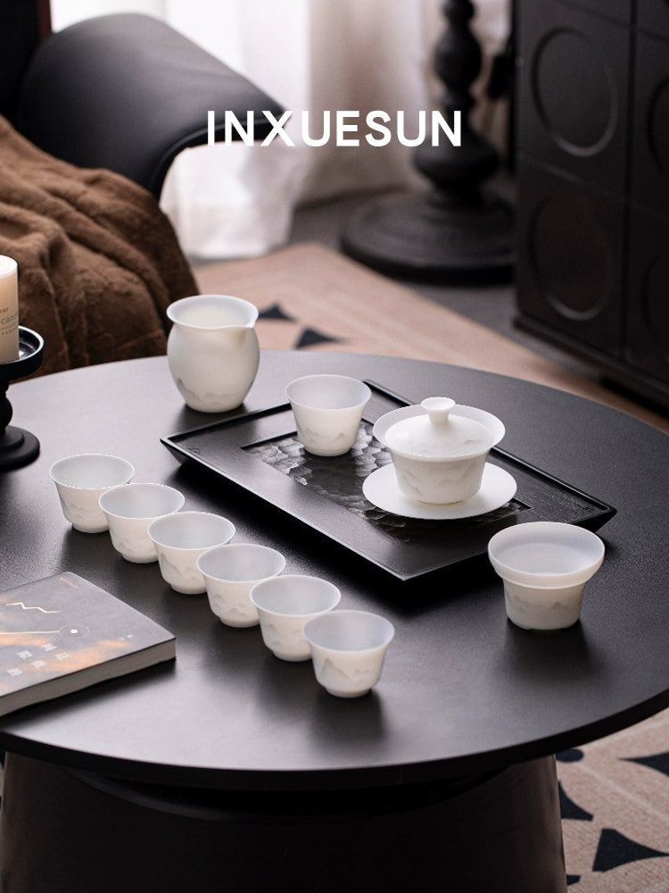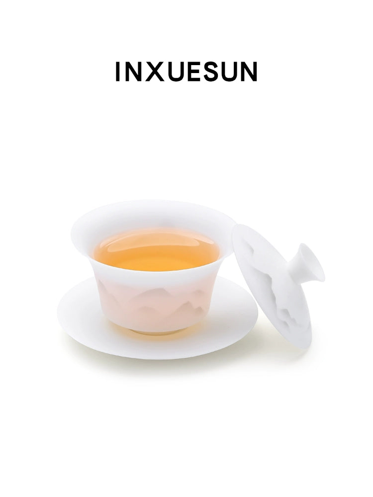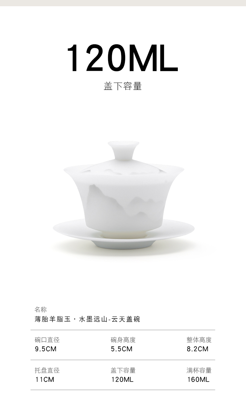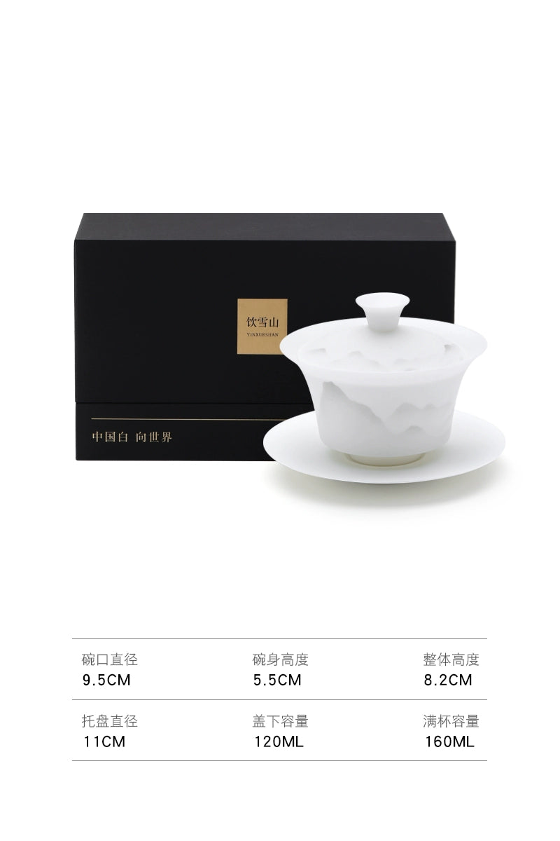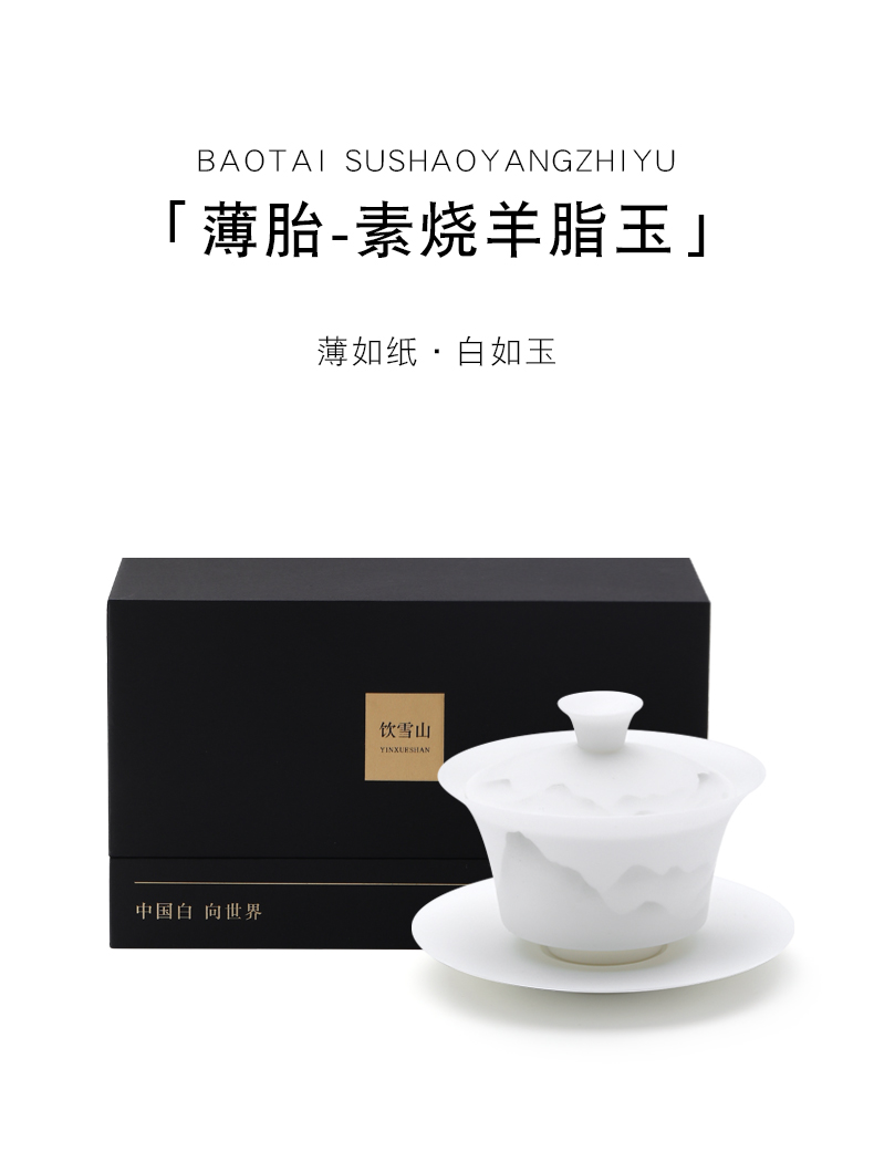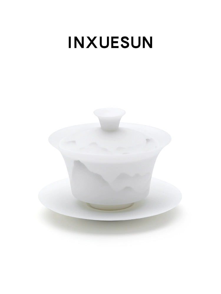 • Thin tire suet jade white porcelain "Yuanshan" three talents cover bowl teacup set, a single high-end kung fu tea set is not hot to make