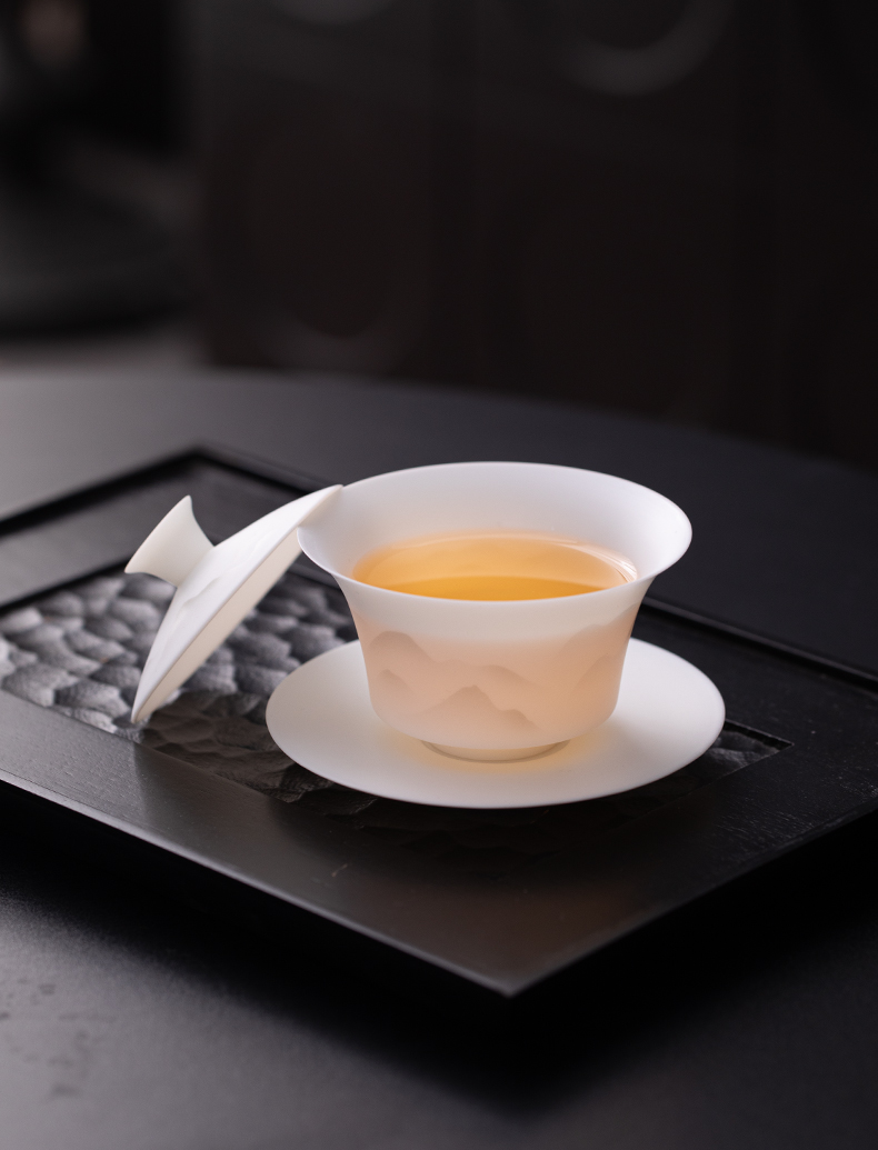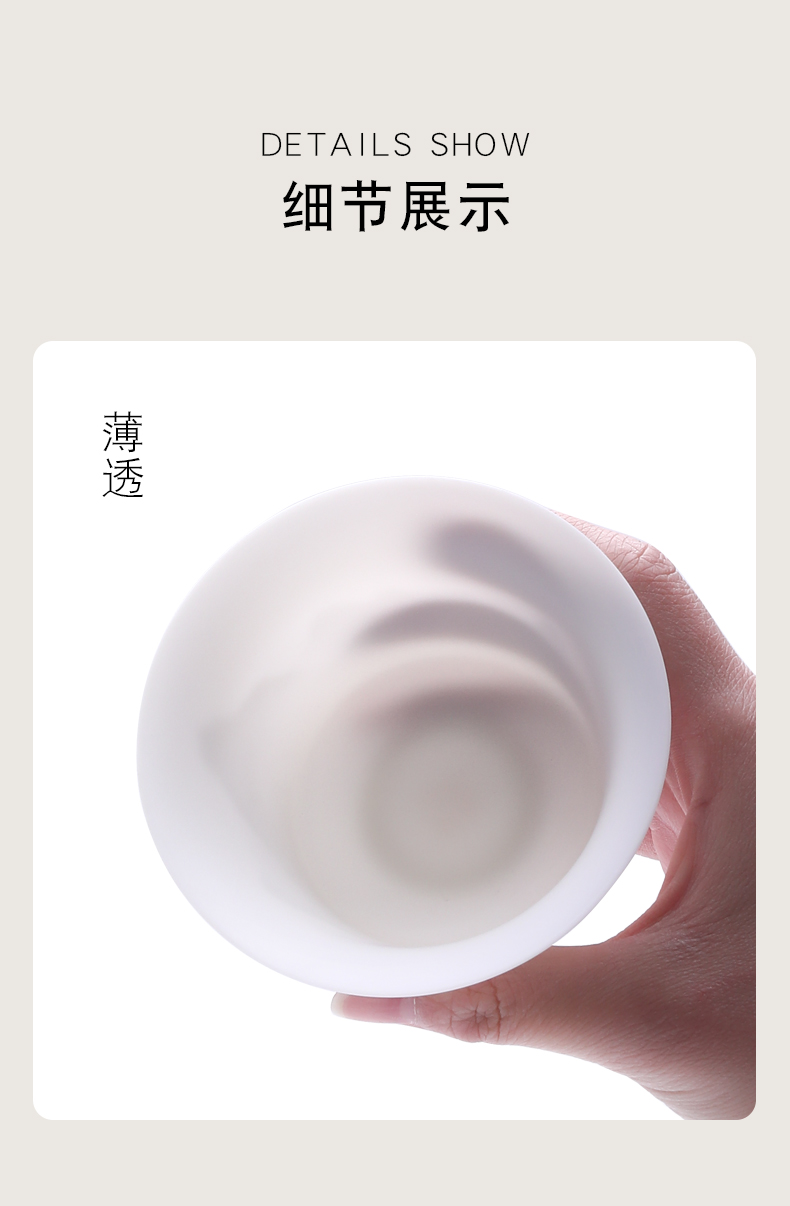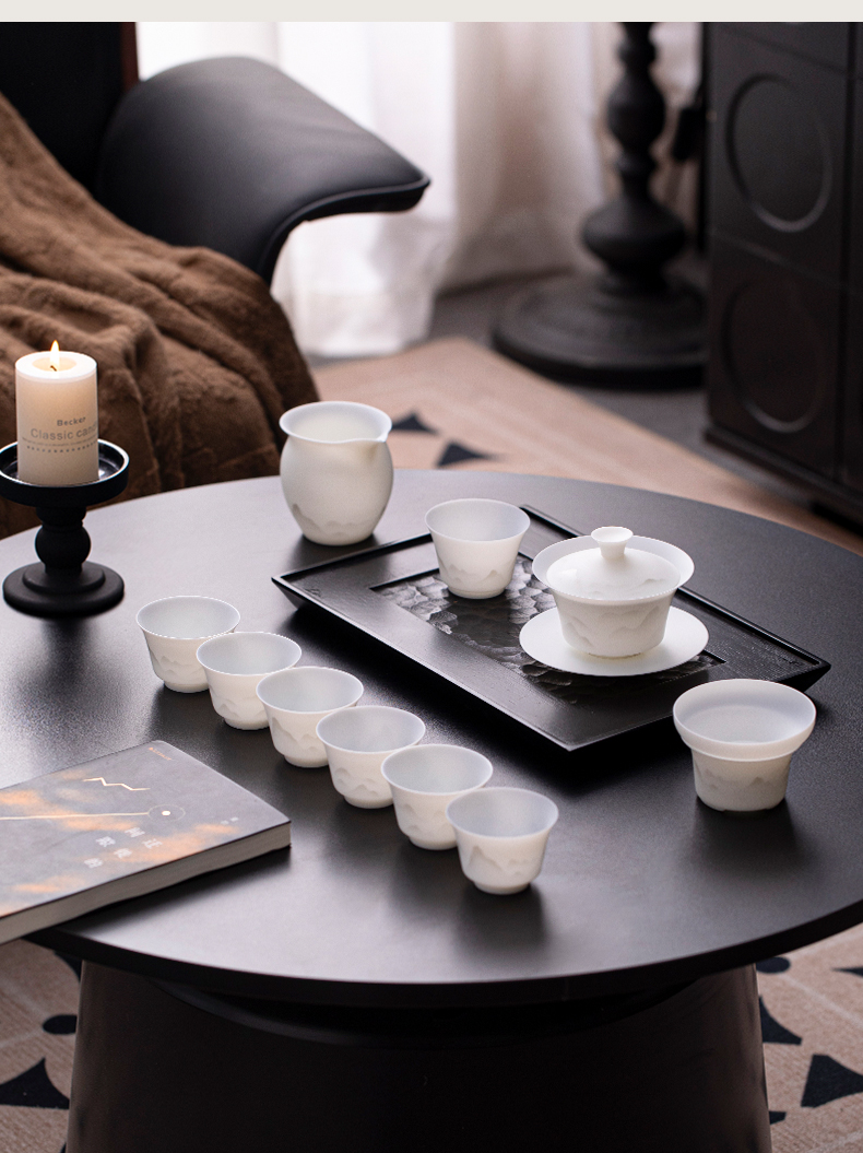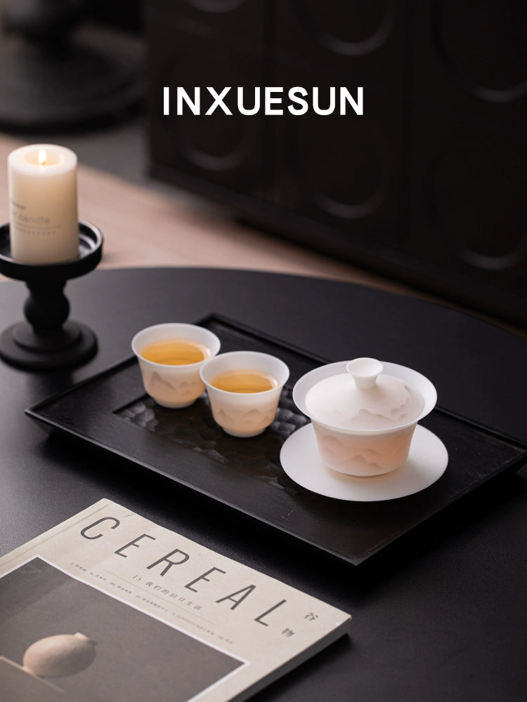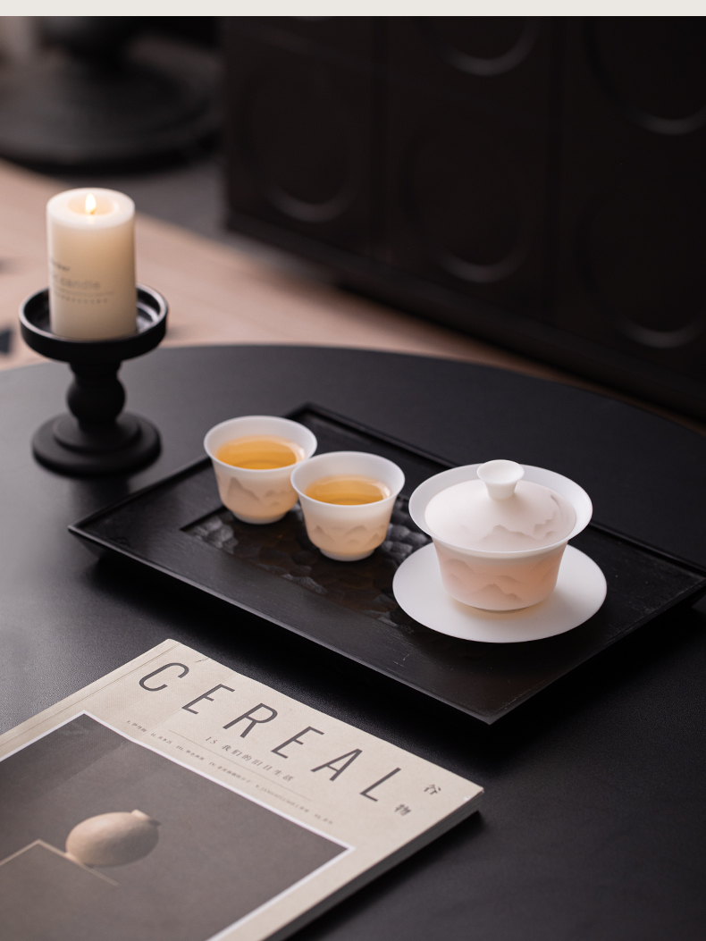 • Thin tire suet jade white porcelain "Yuanshan" three talents cover bowl teacup set, a single high-end kung fu tea set is not hot to make